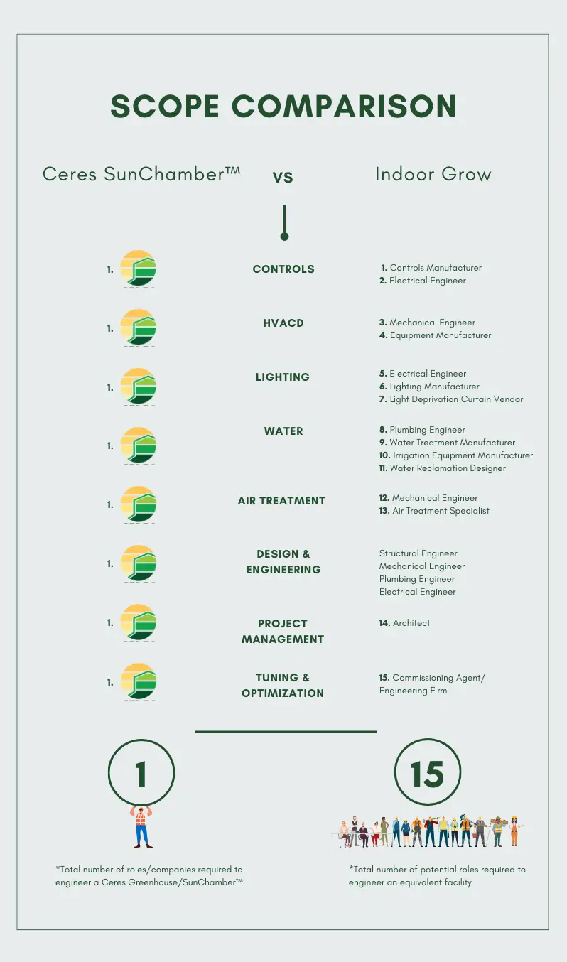 To fully demonstrate what we mean when we say we handle most of the project scope, we’ve put together a graphic that compares the design and equipment scope of an indoor grow and a Ceres SunChamber™. As you can see, to get an indoor operation up and running you would potentially need to employ 14 different roles. This requires a lot of time and energy to find different engineers, designers, manufacturers and specialists and then manage communication between these roles so the project is completed efficiently and without pitfalls.